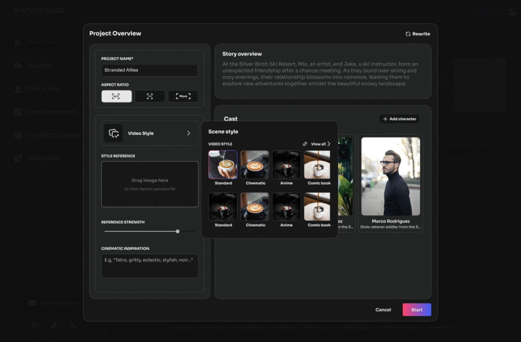 Select a visual style—cinematic, anime, comic, corporate, and more.